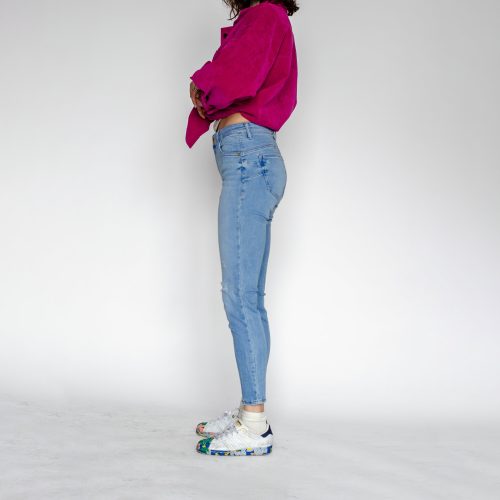 Upgrade your denim collection with these light wash, high-waisted skinny jeans. Featuring a subtle distressed look with a ripped detail on the knee, these jeans offer a perfect blend of classic style and modern edge. The super-stretchy fabric provides a comfortable, form-fitting silhouette that’s perfect for everyday wear.