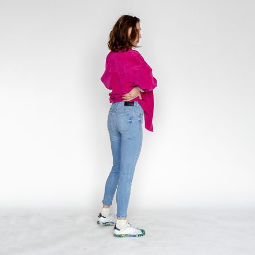 To maintain the quality and distressing of the denim, we recommend washing inside out on a gentle cycle in cold water and tumble drying on low.