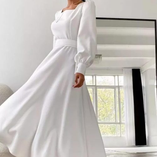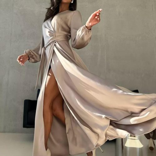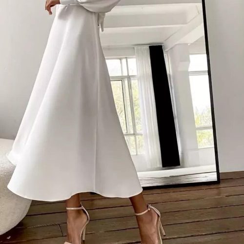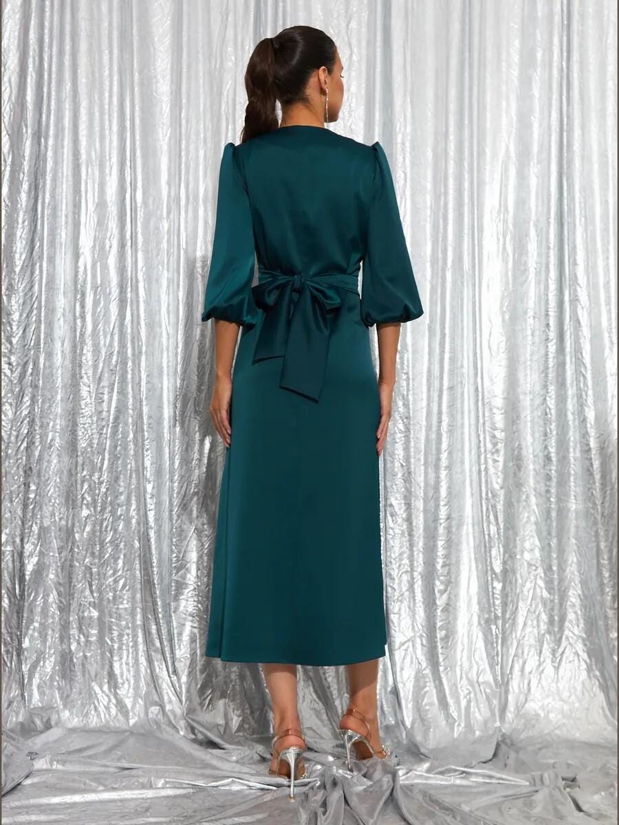 Our silk dress drapes in a flattering A-line cut, brushing the waist and flaring softly. Choose your favorite neckline (Round, V, Square, Boat) and sleeves (from sleeveless to long straight). Satin-lined pockets are discreetly hidden at the hips. Length falls mid-calf or ankle.