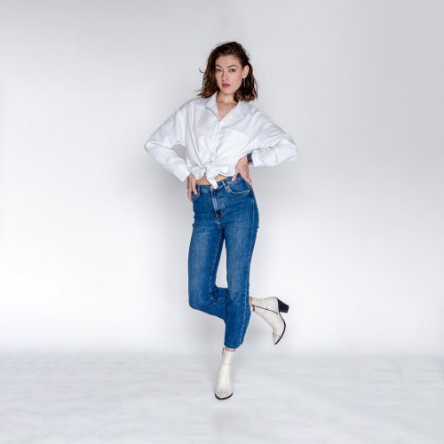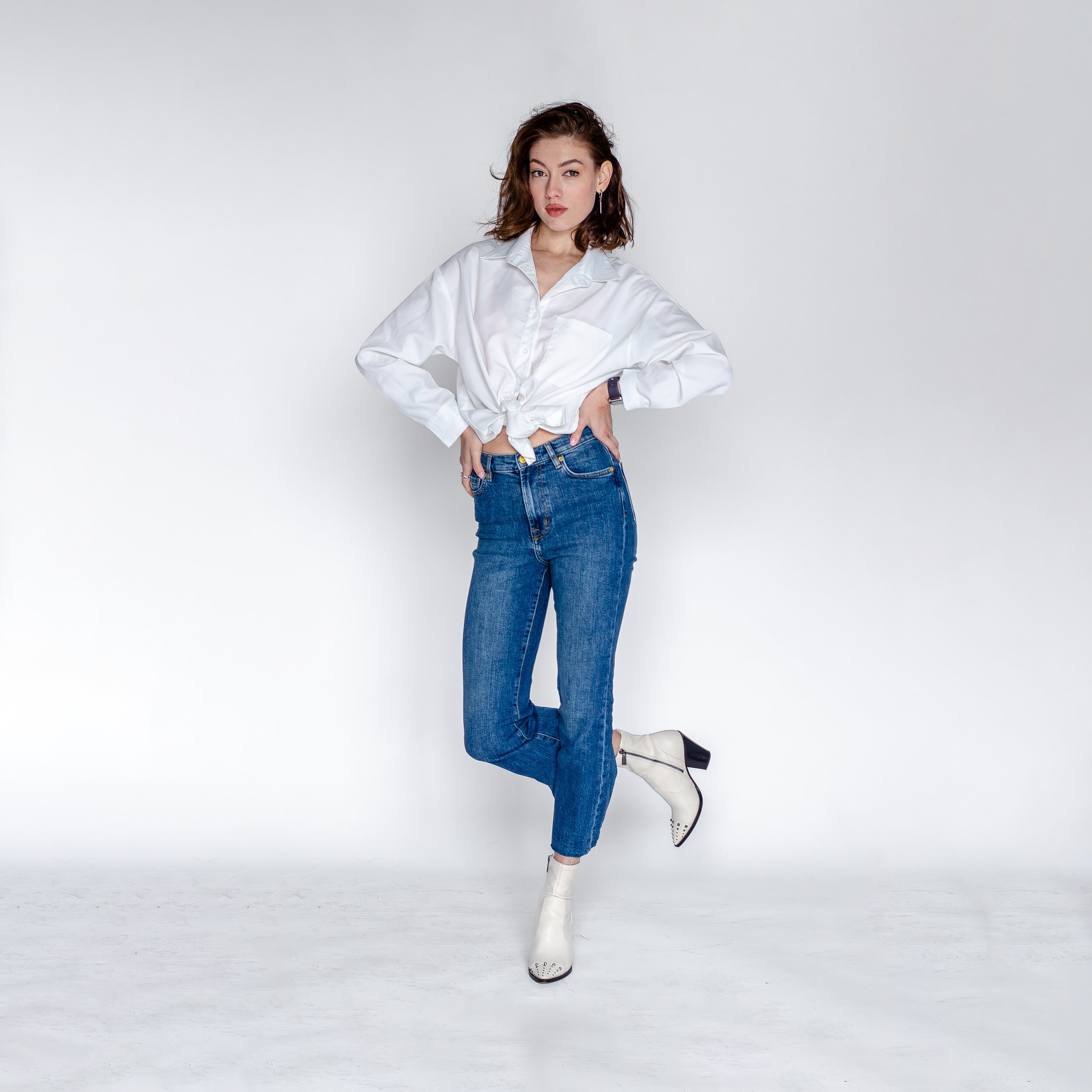 Channel a retro-chic vibe with these stylish high-waisted cropped bootcut jeans. The flattering high-rise fit and classic bootcut silhouette create a leg-lengthening effect, while the cropped length adds a modern twist. The raw, frayed hem gives them a unique, edgy finish perfect for showing off your favorite boots or heels.