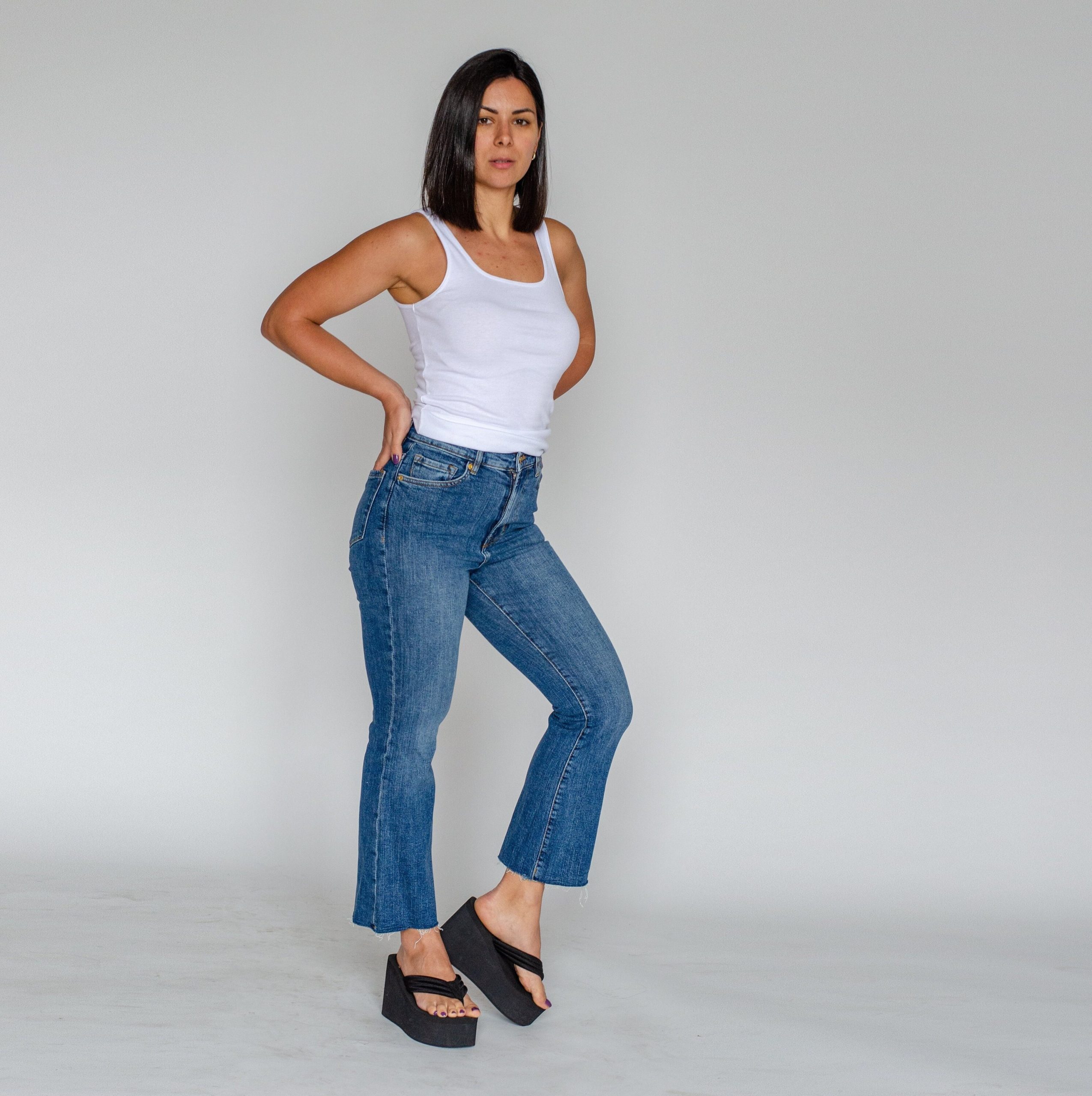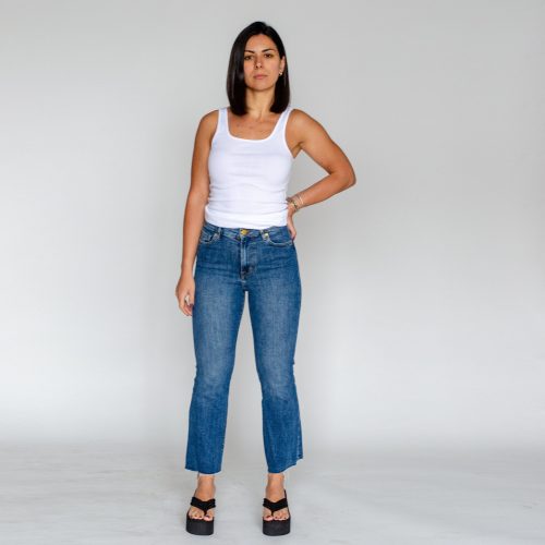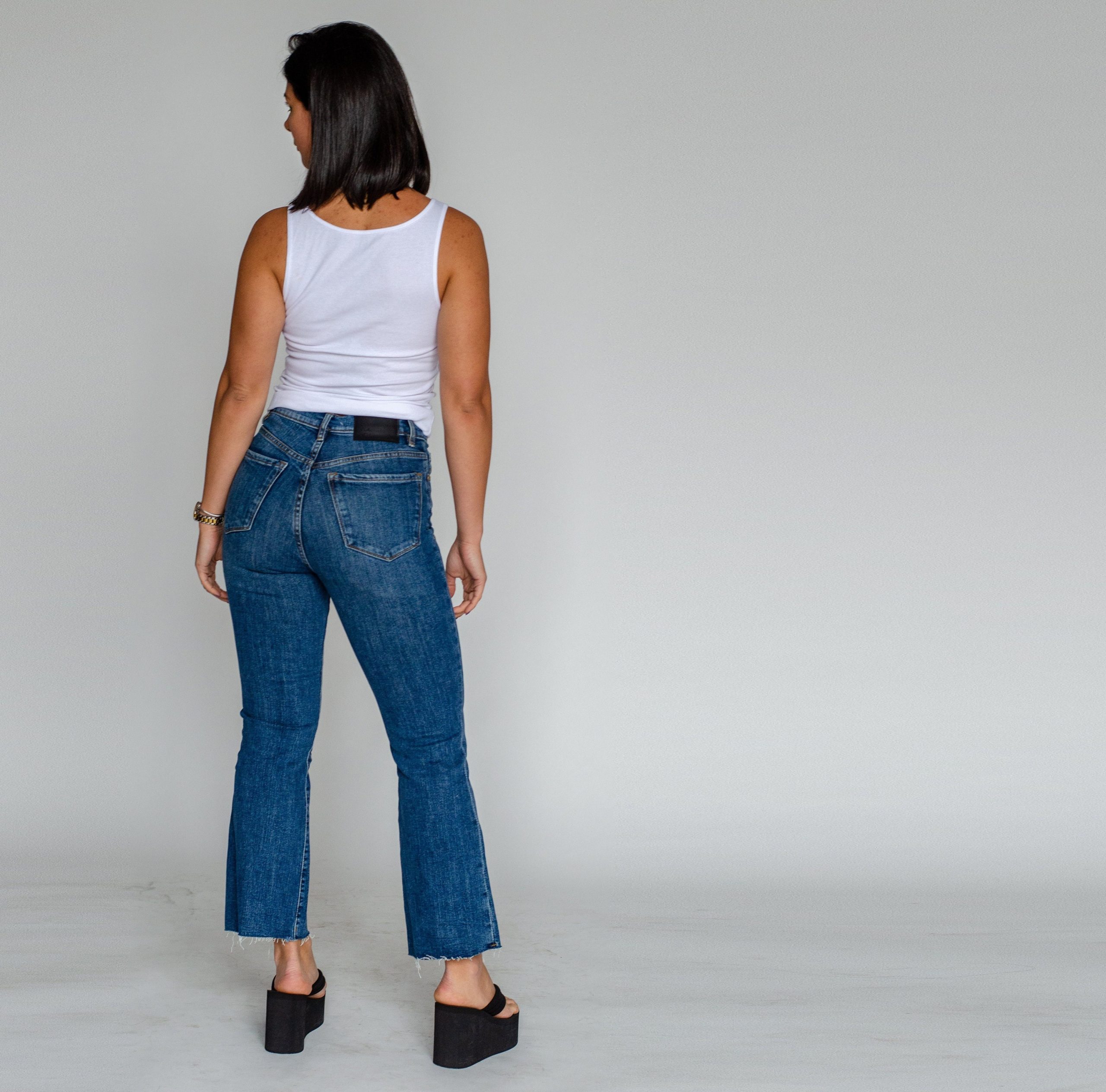 A pair of stretch-denim jeans featuring a mini flare, ankle length, high rise, five-pocket construction, frayed trim, belt loops, front zip, and metal button closure.